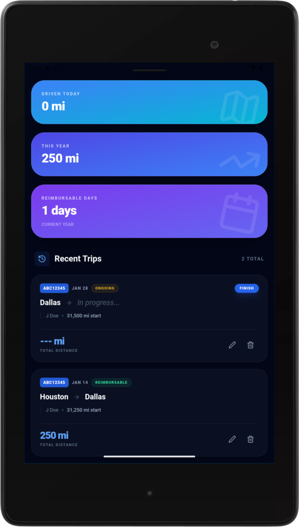 This Driver Log book is an easy to use tool that keeps track of daily, monthly and yearly distance driven. You can also mark days as “Reimbursable” and it will total up your reimbursable days. You can download your history to a PDF for easy sharing.